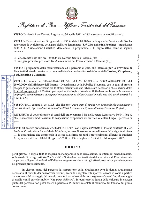 La Provincia di Pisa ha autorizzato lo svolgimento della storica gara ciclistica Giro delle due Province, giunta alla sua 83° edizione, e organizzata dalla ASD Associazione Ciclistica Marcianese. Ancora grande ciclismo e tante emozioni nel nostro territorio.