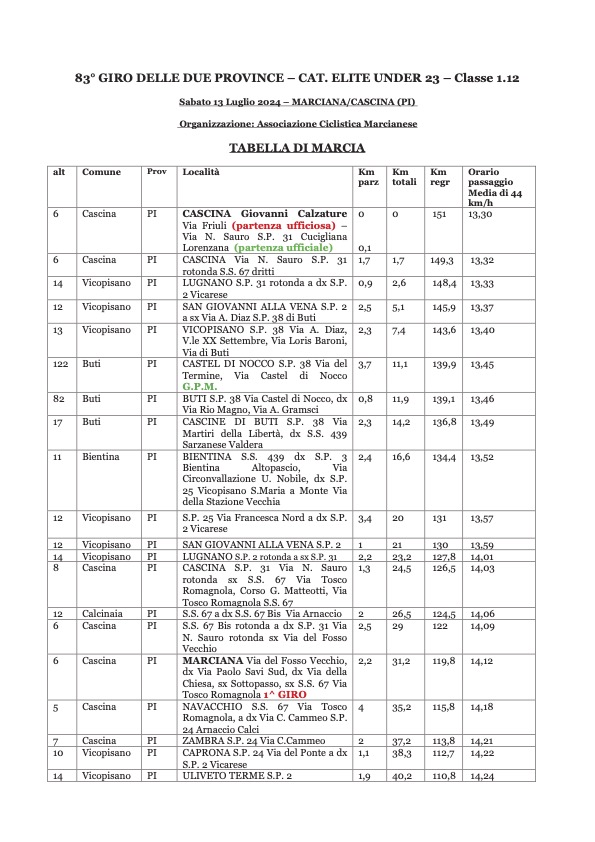 In programma il 13 luglio, con partenza alle 13:30 da Cascina, fine alle 16:56 a Cascina e passaggio anche nel nostro Comune (con sospensione temporanea del traffico al momento del passaggio della gara).
