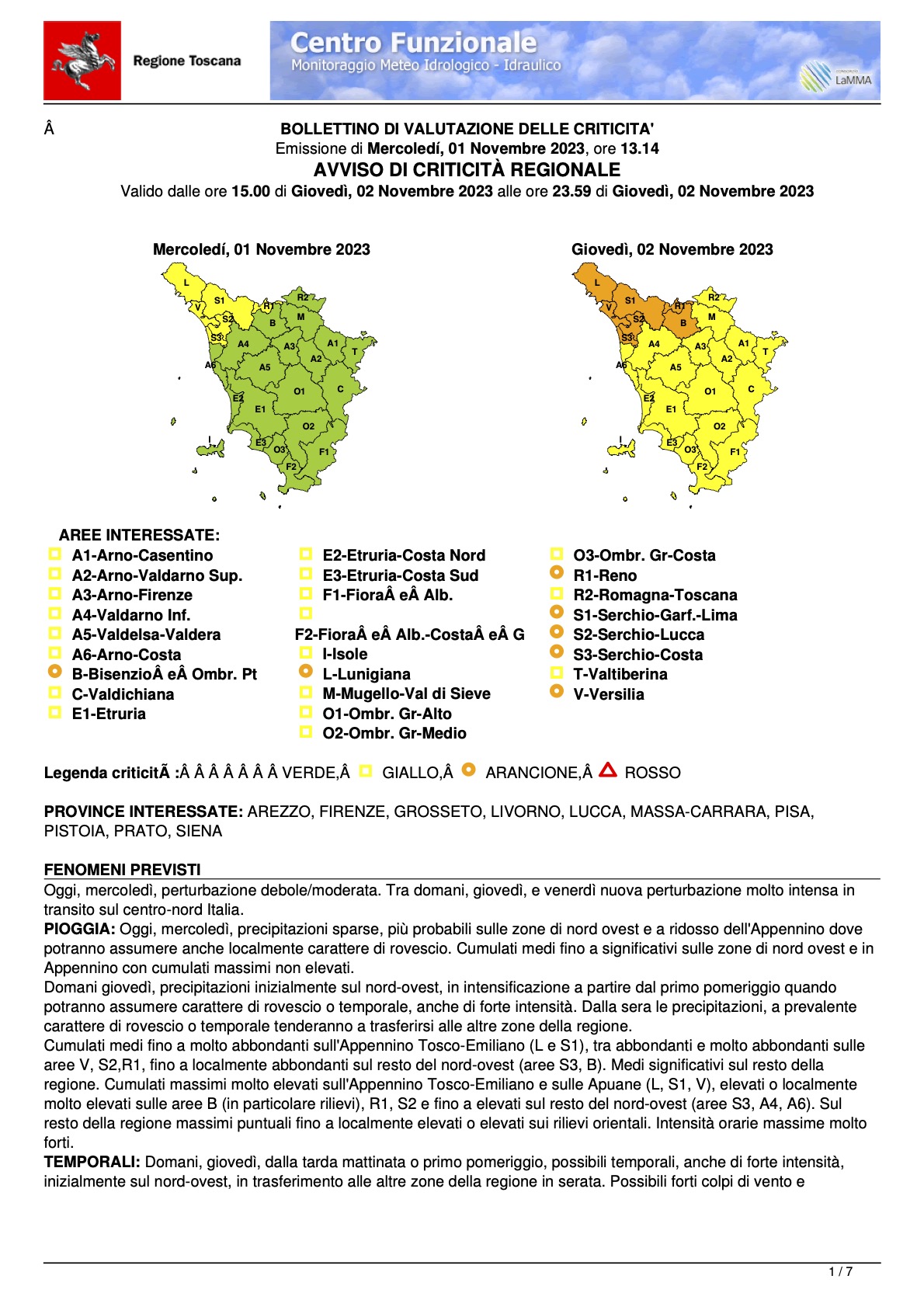 In allegato il Bollettino di Valutazione delle Criticità Meteo del Centro Funzionale del Consorzio LaMMA (consorzio pubblico tra Regione Toscana e Consiglio Nazionale delle Ricerche).