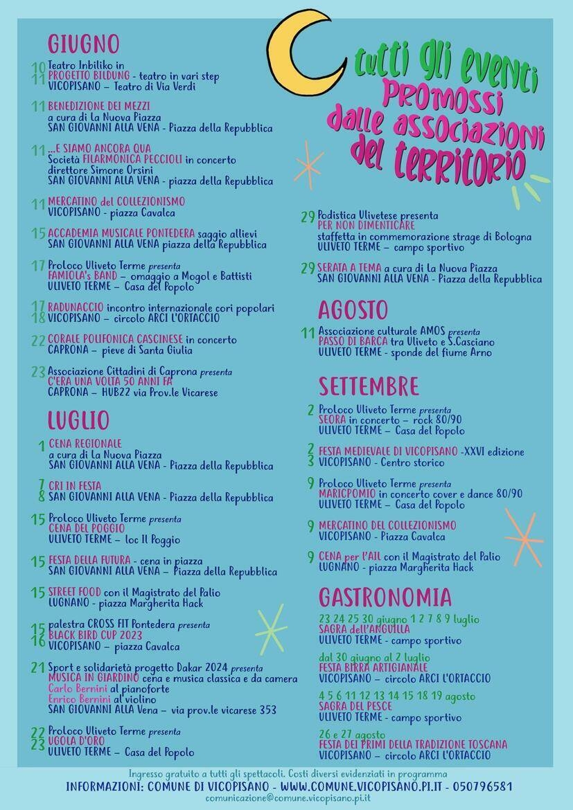 Teatro, concerti, danza, opera, musica dal vivo, eventi per bambini, eventi gastronomici, solidarietà, mercatini, Rocca'n'Roll, Musicastrada, Utopia del Buongusto, cinema sotto le stelle, cene sotto le stelle, Montepisano Art Festival, mostre, sport, Festa Medievale e tanto altro ancora...