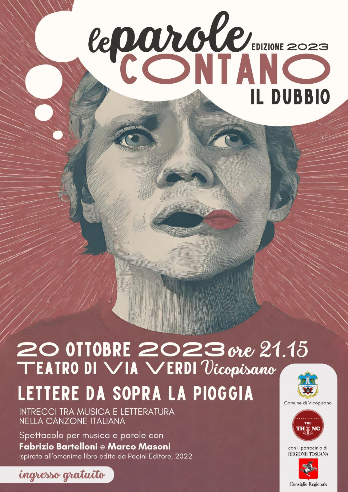 "Marco Masoni e io _ spiega l'autore Fabrizio Bartelloni _ porteremo in scena, per l'occasione, le nostre 'Lettere da sopra la pioggia'. Non si tratterà di una ordinaria presentazione dell'omonimo libro pubblicato da Pacini, ma di un vero spettacolo in cui tra racconto, musica e immagini approfondiremo alcuni dei più felici intrecci tra canzone d'autore italiana e letteratura."