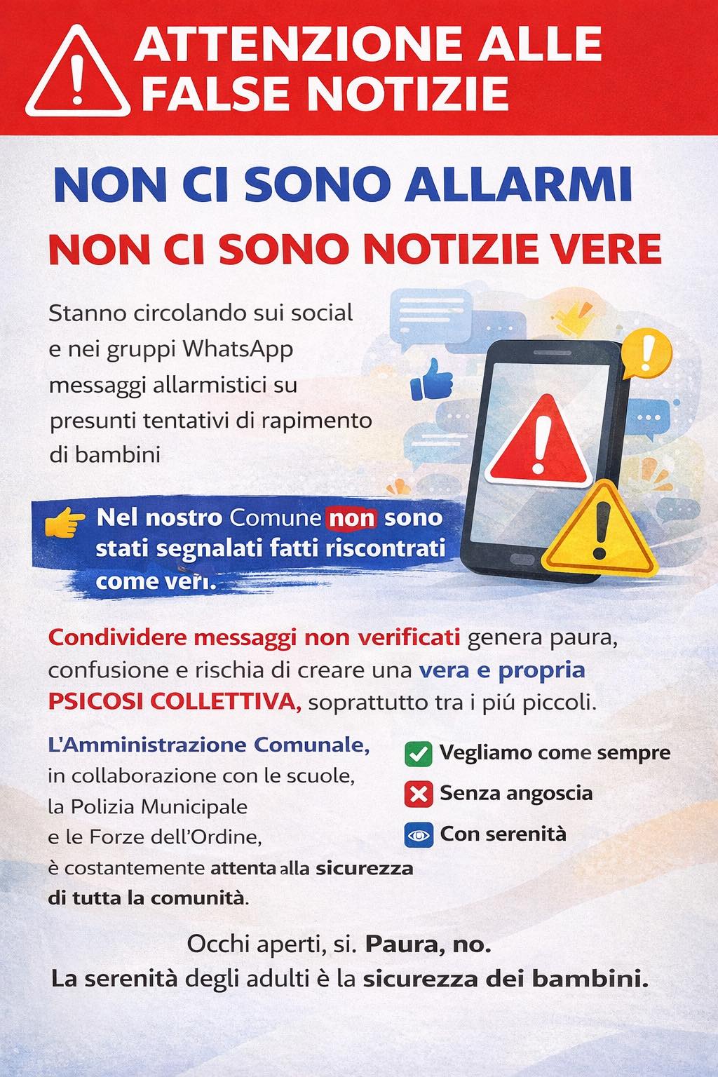 NESSUN ALLARME! In queste ore stanno circolando sui social network e su gruppi WhatsApp numerosi (e NON VERITIERI) messaggi allarmistici relativi a FALSI tentativi di rapimento di bambini, diffusi purtroppo a seguito del clamore di fatti di cronaca ravvicinati avvenuti fuori dal nostro territorio (in alcun modo non legati).