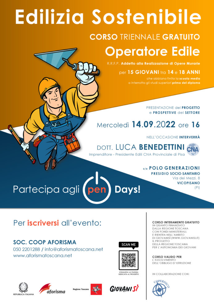 Edilizia sostenibile: mercoledì 14 settembre, al "Polo Generazioni", open day, nel distretto socio-sanitario di Vicopisano, per la presentazione del corso gratuito della società cooperativa Aforisma per i giovani tra i 14 e i 18 anni