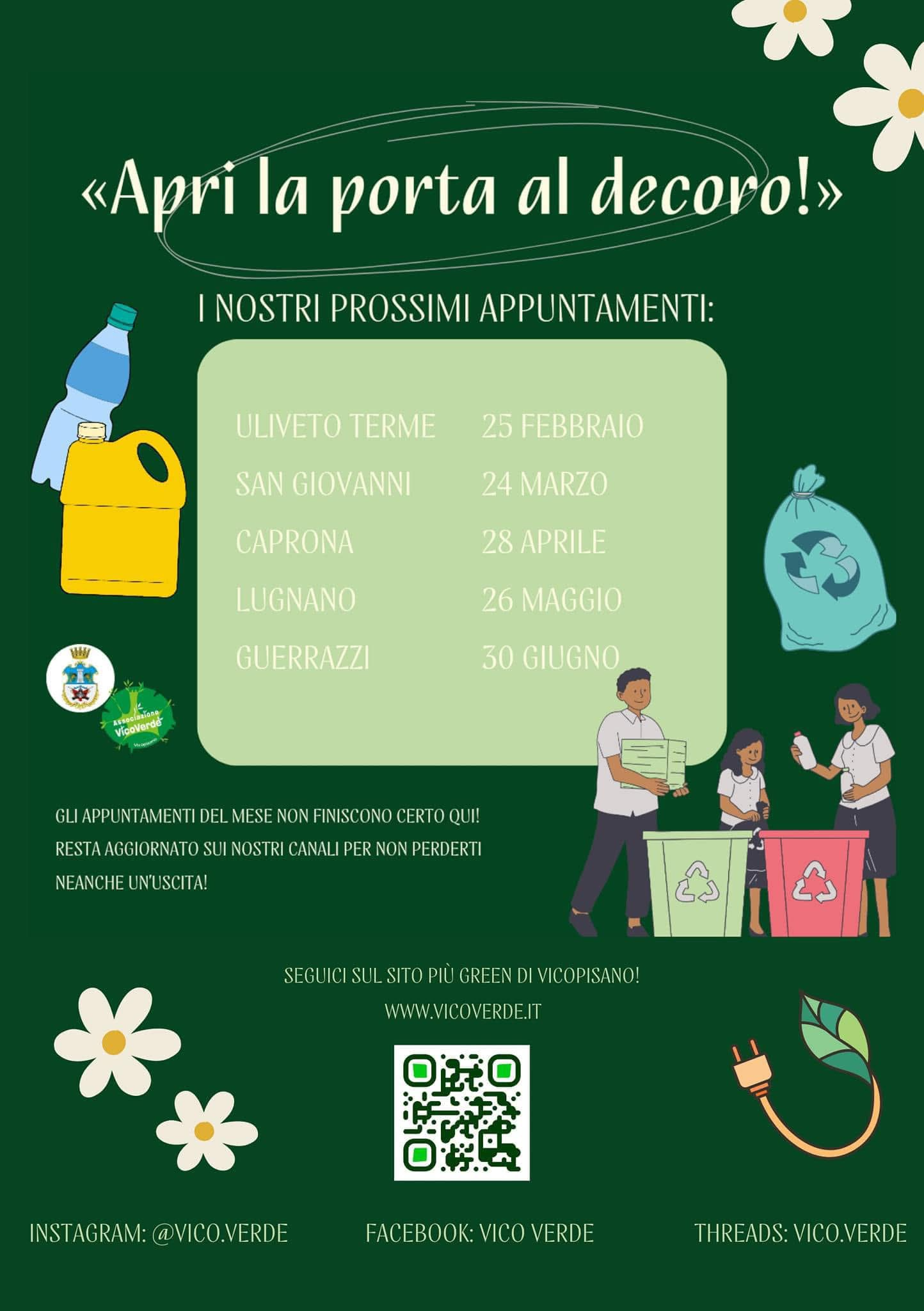 Riprendono gli appuntamenti di Apri la porta al decoro”, l’iniziativa di Vico Verde e del Comune di Vicopisano, in collaborazione con Plastic Free, da tre anni è il nostro modo più semplice (e più incisivo) di volere bene ai luoghi che attraversiamo ogni giorno.