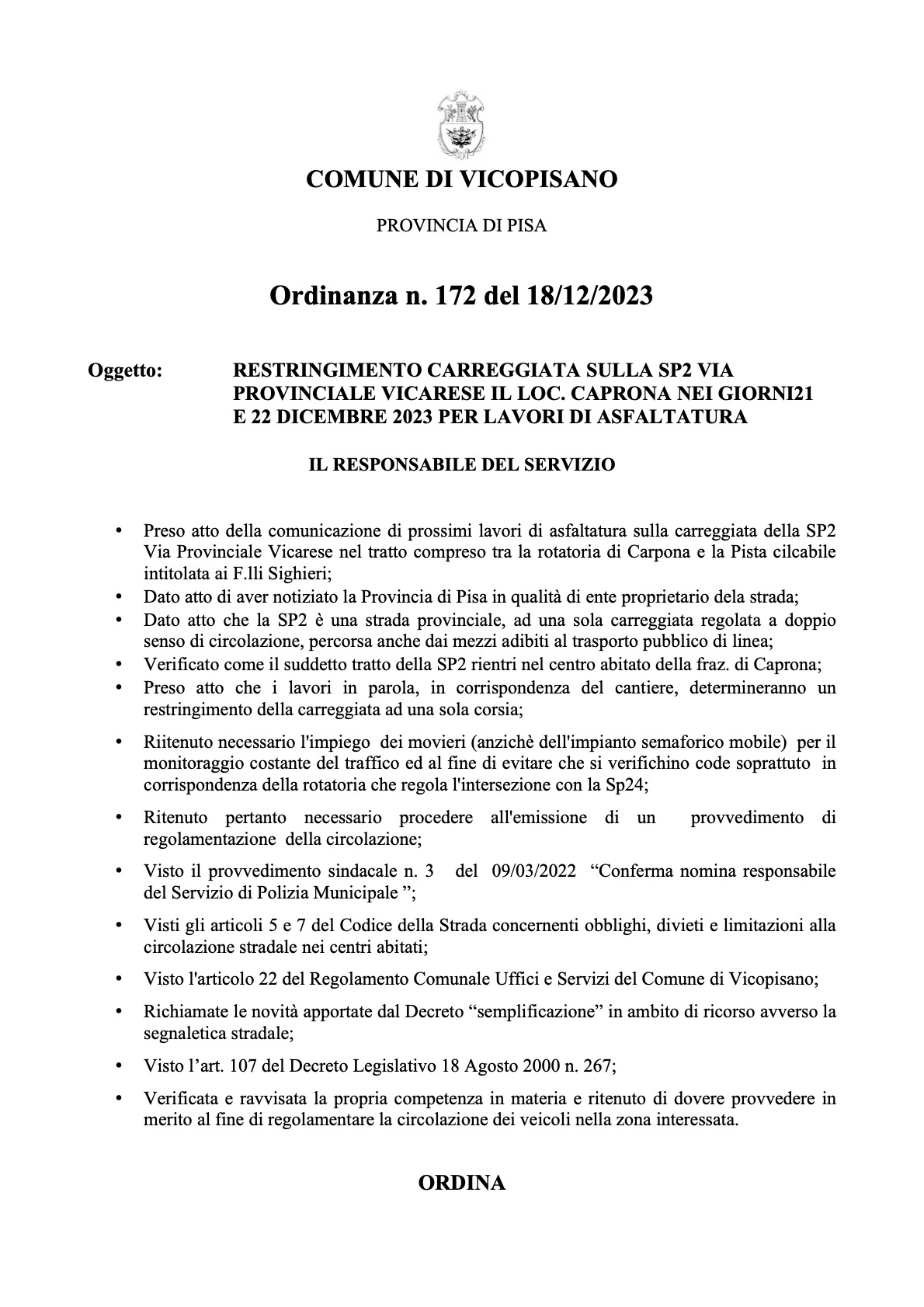 Restringimento della carreggiata sulla Provinciale Vicarese, a Caprona, nei giorni 21 e 22 dicembre, per lavori di asfaltatura nel tratto compreso tra la rotatoria di Caprona e la pista ciclopedonale.