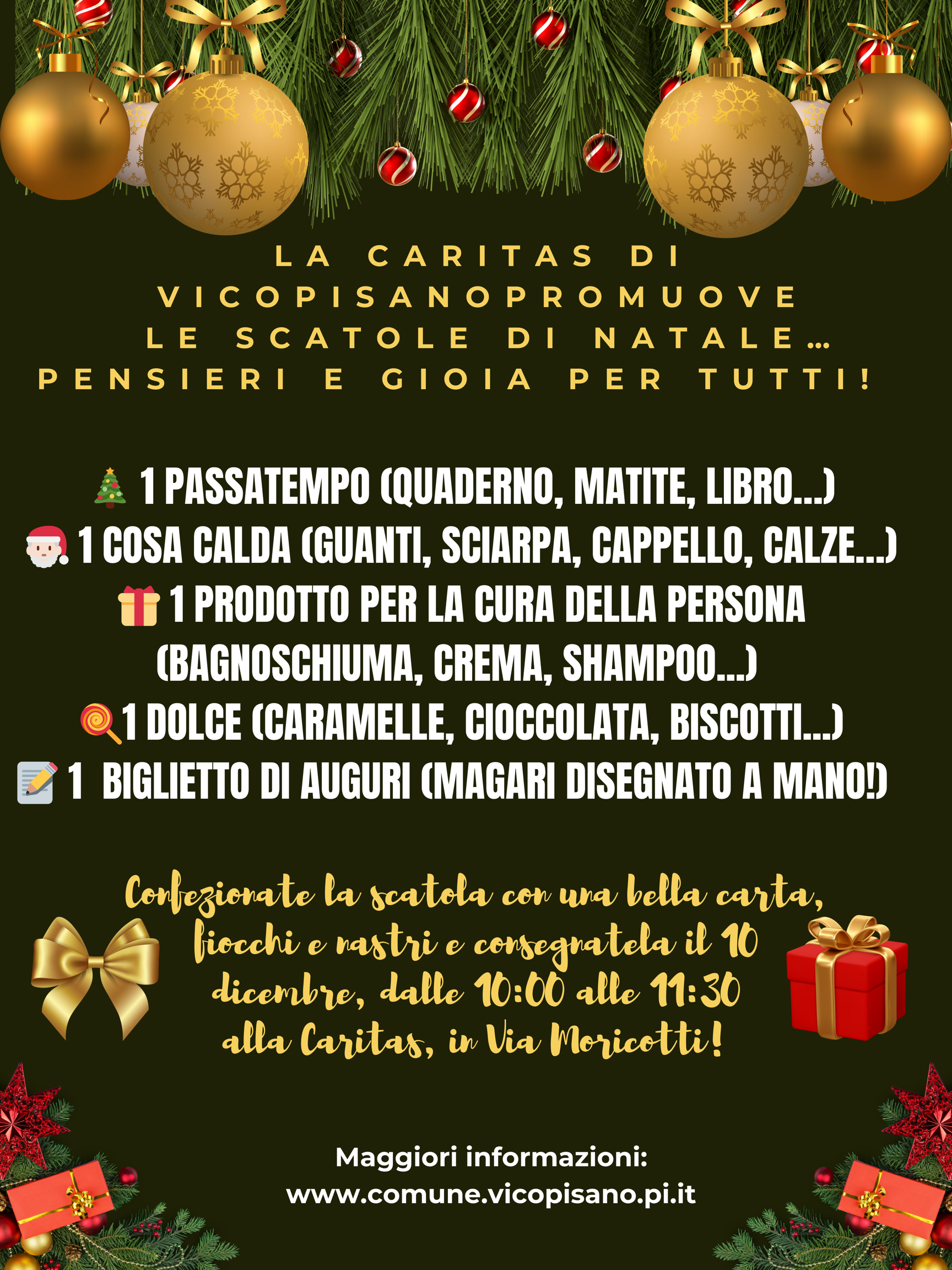 La Caritas parrocchiale di Vicopisano propone... "Scatole di Natale", gioia, calda atmosfera, regali e auguri. Si tratta, infatti, di veri e propri pacchi natalizi, che ognuno e ognuna di noi può confezionare e avere così un pensiero speciale per le famiglie e le persone più in difficoltà.