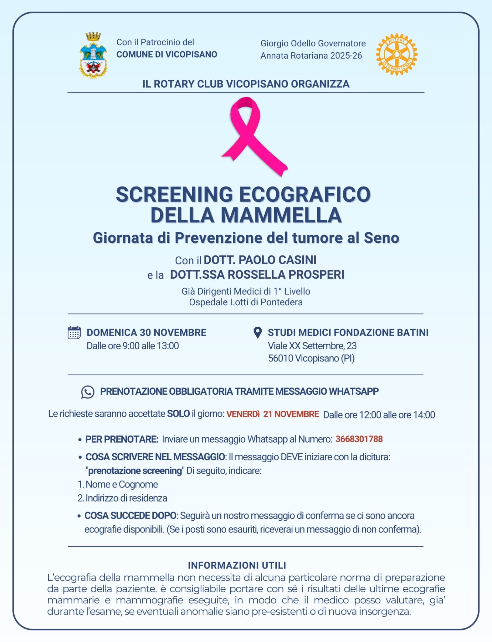 "La prevenzione è uno dei gesti più concreti e preziosi che possiamo compiere per la nostra salute. Ringrazio il Rotary Club Vicopisano _ sono le parole del Sindaco Matteo Ferrucci _ per questa nuova iniziativa di grande valore, che offre un servizio qualificato e gratuito alle nostre concittadine. Investire nella prevenzione significa investire nel benessere reale della comunità."