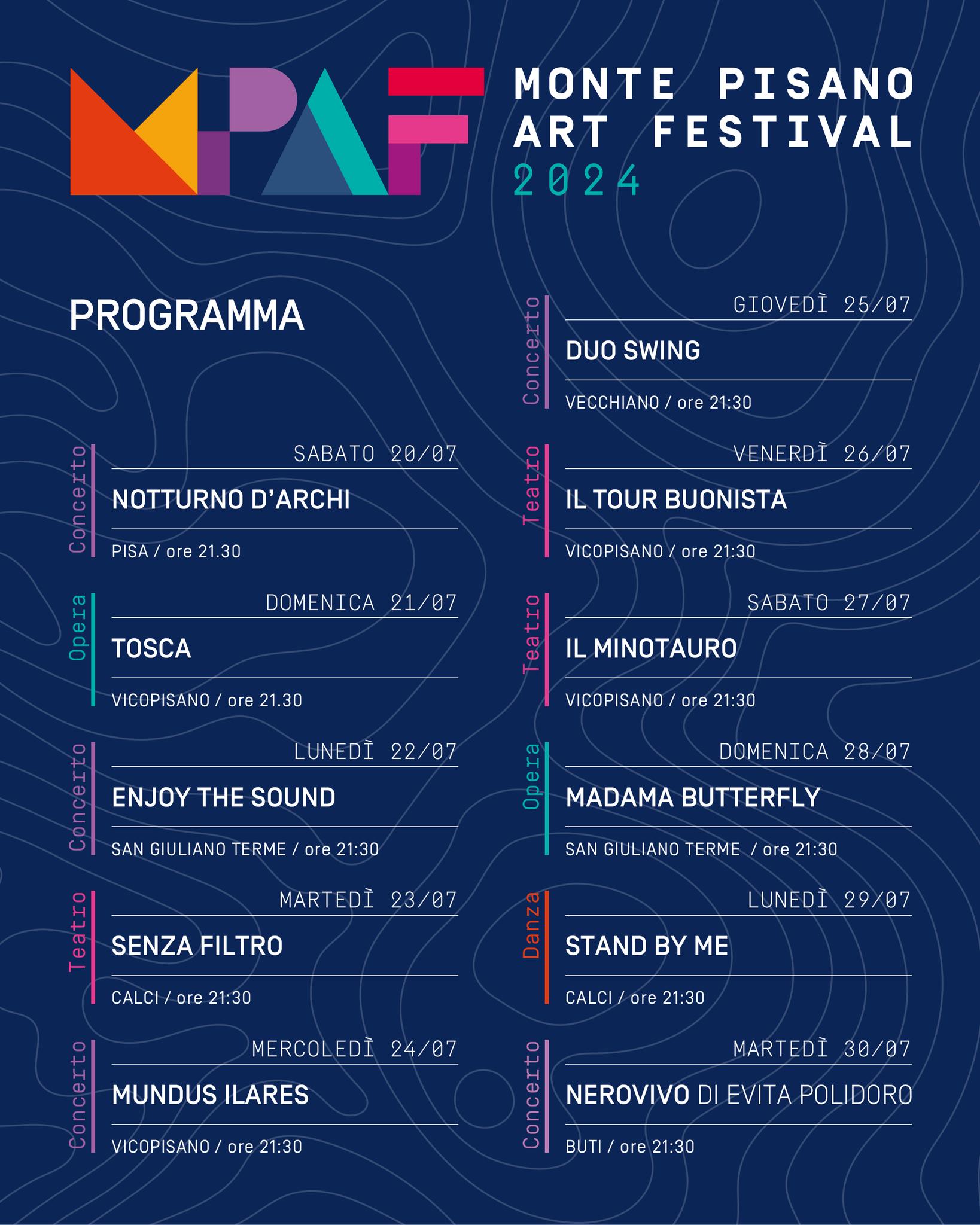 Andrea Gottfried, direttore artistico del MPAF: “Una grande, meravigliosa sala da concerto a cielo aperto tra le colline pisane e la costa: questo è il Monte Pisano Art Festival che, in un viaggio a tappe, propone musica di qualità, spettacoli teatrali originali e opportunità per scoprire anche i sapori e le bellezze naturali. Questa terza edizione è ancora più ricca: radicata espressione del territorio ma anche vetrina per i turisti e i visitatori. Strumento di promozione attraverso l’arte. Non a caso abbiamo scelto luoghi iconici in cui ogni spettacolo è pensato ‘su misura’ per lo spazio che lo accoglie”.