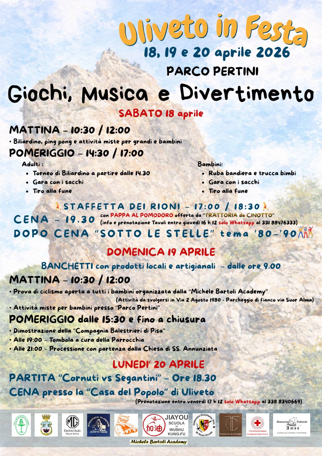 Dal 18 al 20 aprile 2026 torna a Uliveto Terme “Uliveto in Festa”, un appuntamento pensato per stare insieme, divertirsi e vivere il paese attraverso momenti di gioco, convivialità, sport, musica e tradizione.
