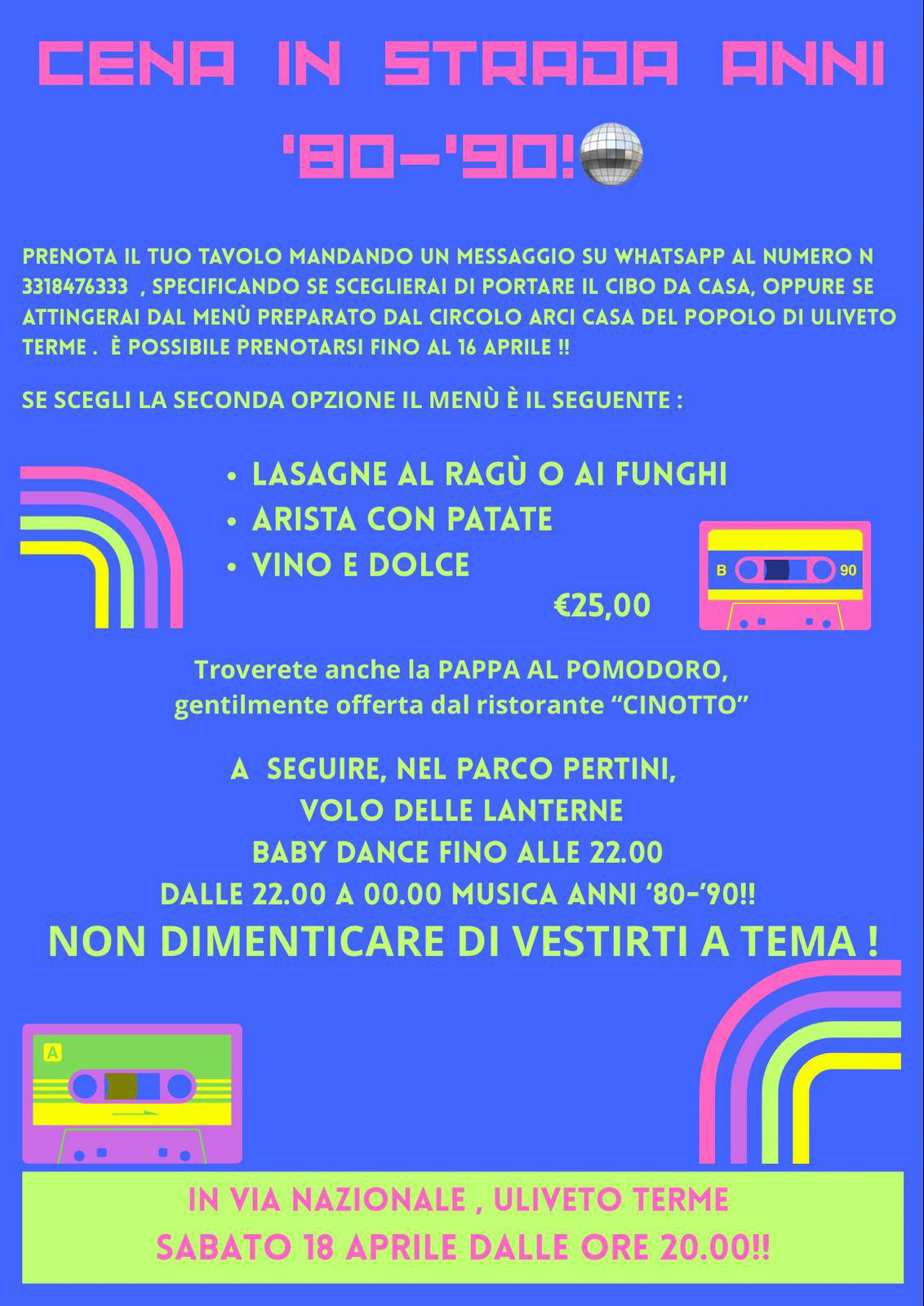 A rendere ancora più speciale il sabato ci sarà anche la cena in strada a tema anni ’80-’90, in Via Nazionale, con possibilità di prenotare il tavolo scegliendo se portare il cibo da casa oppure optare per il menù preparato dal Circolo Arci Casa del Popolo di Uliveto Terme. Non mancheranno inoltre la pappa al pomodoro offerta dal ristorante Cinotto, il volo delle lanterne, la baby dance fino alle 22:00 e, dalle 22:00 a mezzanotte, ancora musica anni ’80-’90. Un invito, naturalmente, anche a vestirsi a tema, per entrare fino in fondo nello spirito della serata.