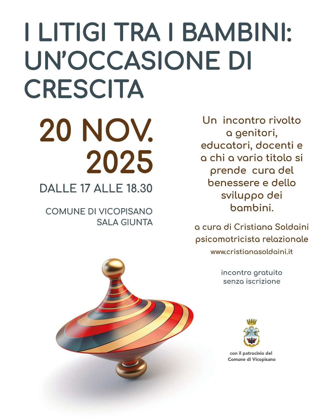 In occasione della Giornata Mondiale dei Diritti dell’Infanzia e dell’Adolescenza, il 20 novembre, dalle 17:00 alle 18:30 in Sala Giunta, il Comune di Vicopisano, avendo aderito all’iniziativa nazionale Diritti in Comune, promossa da ANCI e UNICEF Italia, dedica un incontro su un tema delicato e fondamentale: “I litigi nei bambini. Un’occasione di crescita.”, con Cristiana Soldaini, psicomotricista.