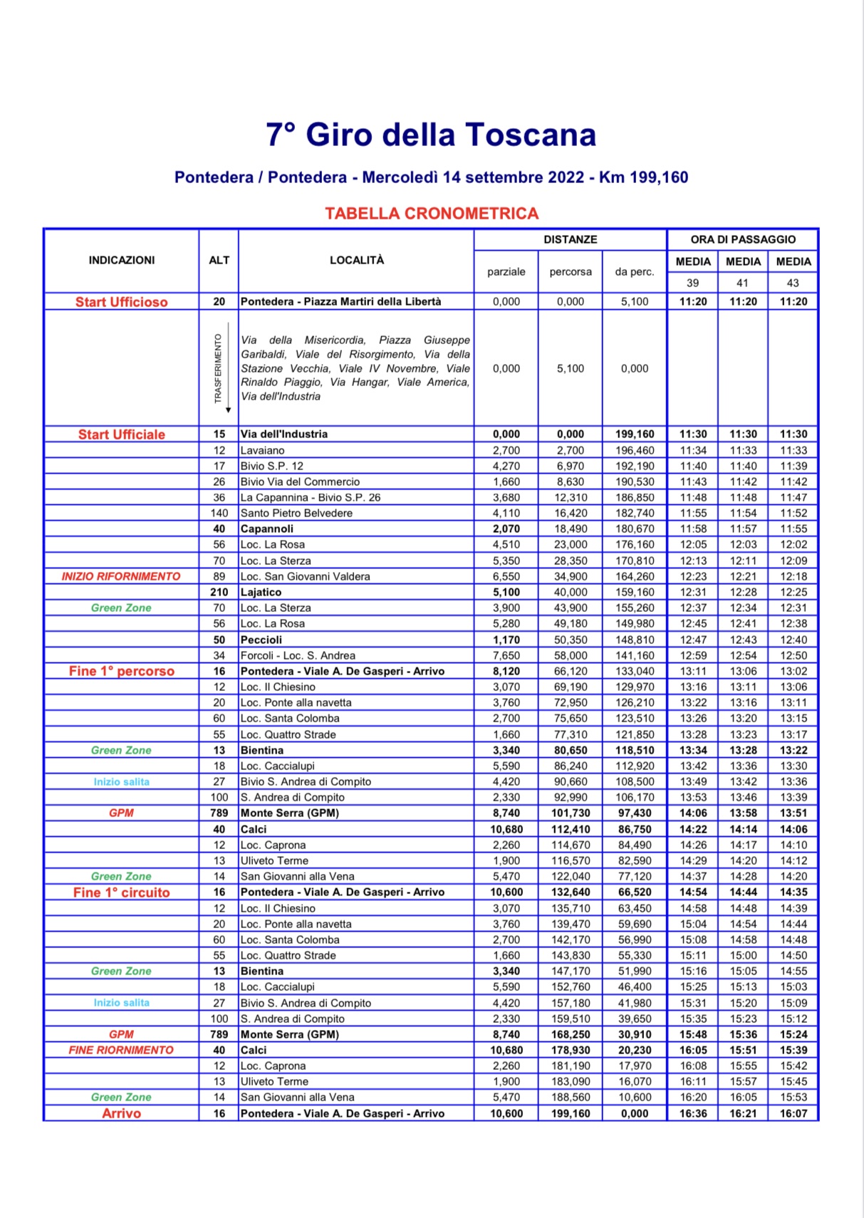I ciclisti attraverseranno, per la Provincia di Pisa, tratti di strade provinciali e comunali nei Comuni di Capannoli, Palaia, Peccioli, Lajatico, Buti, Bientina, Calci, Calcinaia, Casciana Terme Lari, Pontedera, Ponsacco, Santa Maria a Monte e Vicopisano. La Prefettura, nella persona della Viceprefetta Aggiunta, Alessandra Petronelli, ha disposto, con ordinanza, la sospensione della circolazione, per la durata strettamente necessaria al passaggio dei concorrenti (dal momento del passaggio del veicolo con la il cartello mobile "inizio gara ciclistica" fino al passaggio di quello con il cartello mobile "fine gara ciclistica"). In ogni caso la chiusura in ciascun punto del percorso coinvolto non potrà essere superiore a 15 minuti, calcolati al momento del transito del primo atleta.