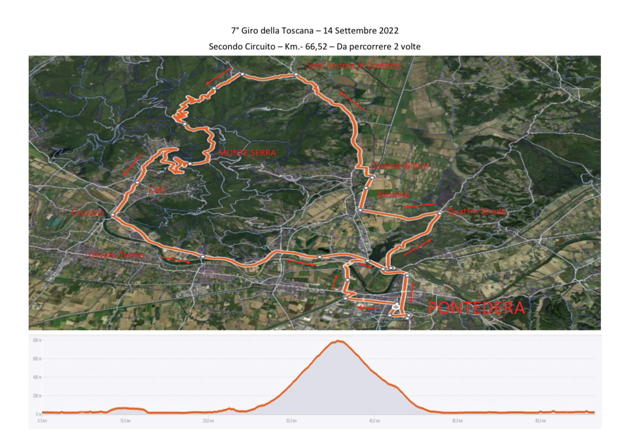 Dopo essere passato da Ponte alla Navetta, Quattro Strade e Bientina, il gruppo arriverà a Sant’Andrea di Compito, dove comincerà la salita verso il Monte Serra. L’ascesa sarà di 11,1 chilometri, di cui buona parte molto impegnativi. Dopo gli atleti scenderanno verso Calci, Caprona, Uliveto Terme e San Giovanni alla Vena.