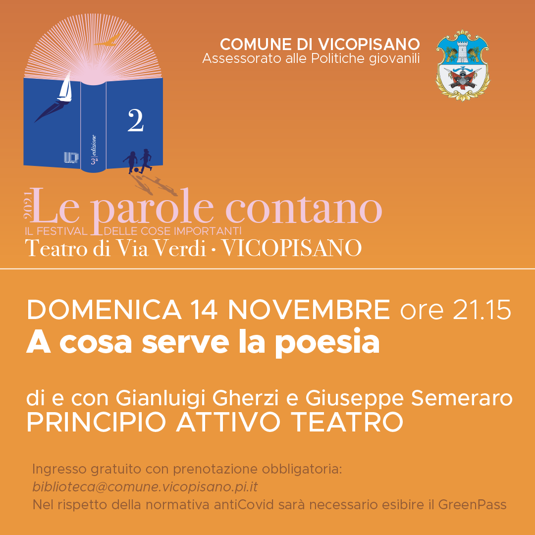 Secondo appuntamento con il festival Le parole contano, domenica 14 novembre, alle 21:15, al Teatro di via Verdi, introdotto dalla Consigliera alla Cultura, Elena Pardini, e dalla pedagogista e formatrice Sara Costanzo.