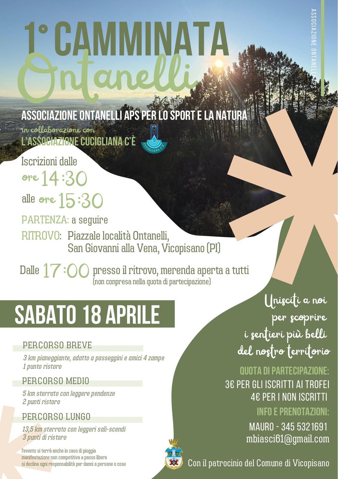 Aperte le iscrizioni per la 1ª Camminata Ontanelli, in programma il pomeriggio del 18 aprile, iniziativa promossa da Ontanelli APS per lo sport e la natura, in collaborazione con Cucigliana c'è. C’è anche la possibilità di iscriversi per partecipare, contestualmente, alla corsa che è valevole per il Trofeo delle 3 province e per il Trofeo Pisano.