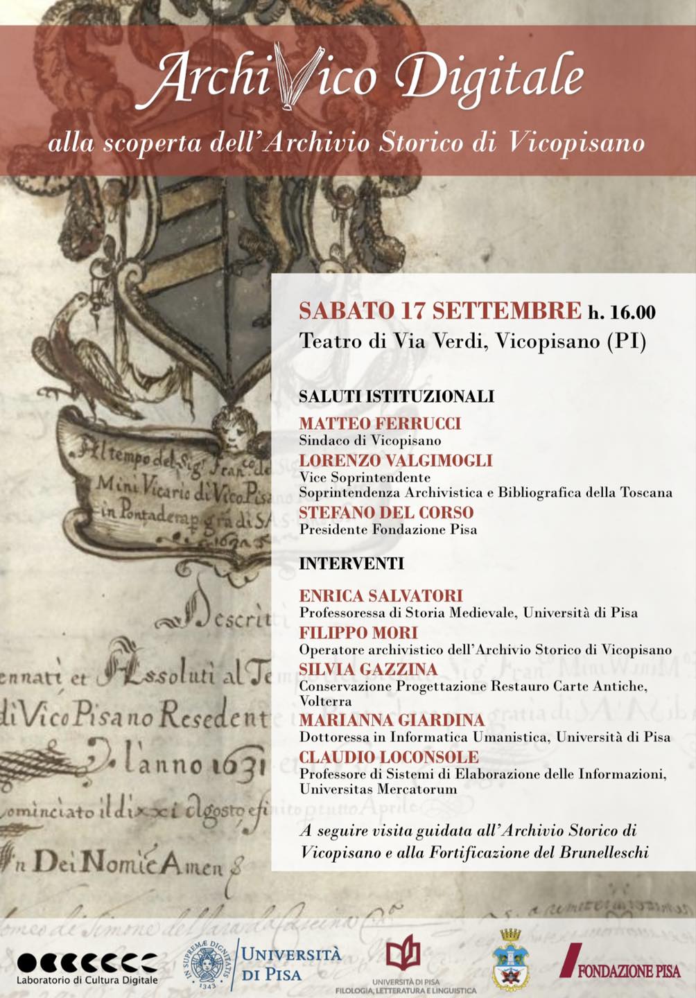 - Alle 16:00 convegno al Teatro di via Verdi di Vicopisano, con i saluti istituzionali del Sindaco Matteo Ferrucci, del Vicesoprintenente della Soprintendenza Archivistica e Bibliografica della Toscana, Lorenzo Valgimogli, e del Presidente della Fondazione Pisa, Stefano Del Corso.Interverranno, per guidarci in questo percorso di conoscenza e approfondimento:
