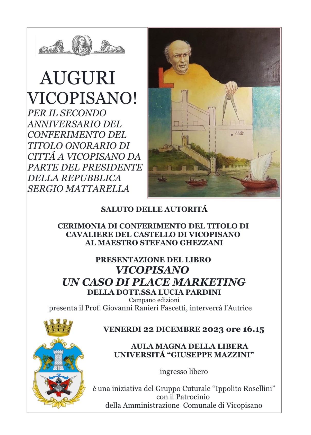 Venerdì 22 dicembre, in occasione del secondo anniversario del conferimento del titolo onorifico di Città a Vicopisano da parte del Presidente della Repubblica Sergio Mattarella, il Gruppo Culturale Ippolito Rosellini organizza l'evento "Auguri Vicopisano".