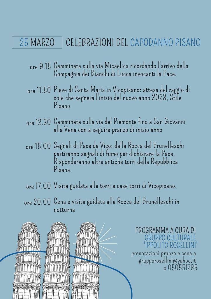 Brunelleschi a Vicopisano prende il via il 25 marzo con le celebrazioni del Capodanno Pisano a cura del Gruppo Culturale Ippolito Rosellini e i segnali di pace dalla Rocca alle torri vicine.