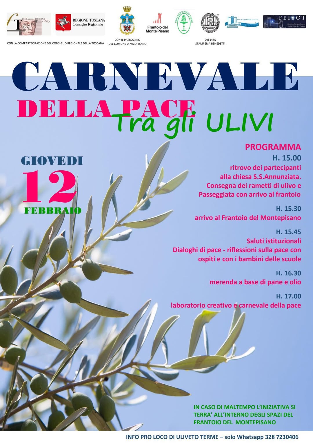 . Ore 15:00, ritrovo dei partecipanti alla chiesa di SS. Annunziata, a Uliveto Terme, consegna dei rametti di ulivo e passeggiata. Ore 15.30, arrivo al Frantoio del Monte Pisano di Caprona. Ore 15:45, saluti istituzionali e dialoghi di pace, con riflessioni insieme agli ospiti e ai bambini e alle bambine delle scuole. Ore 16:30, merenda a base di pane e olio. Ore 17:00, laboratorio creativo e Carnevale della PaceUn’occasione semplice e preziosa per stare insieme, ascoltarsi, camminare e seminare parole buone, soprattutto per i più piccoli.