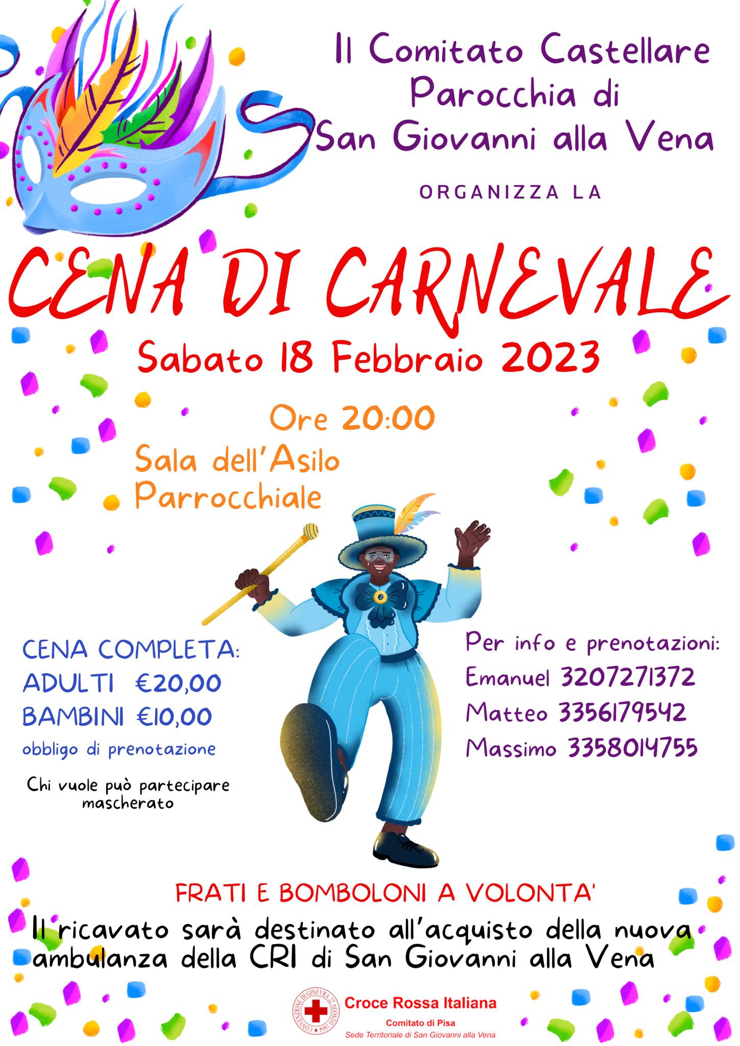 Carnevale e Solidarietà, il Comitato Castellare e la Parrocchia di San Giovanni Alla Vena hanno organizzato una cena a tema, in maschera per chi vuole, sabato 18 febbraio alle 20:00, nella sala dell'asilo parrocchiale.