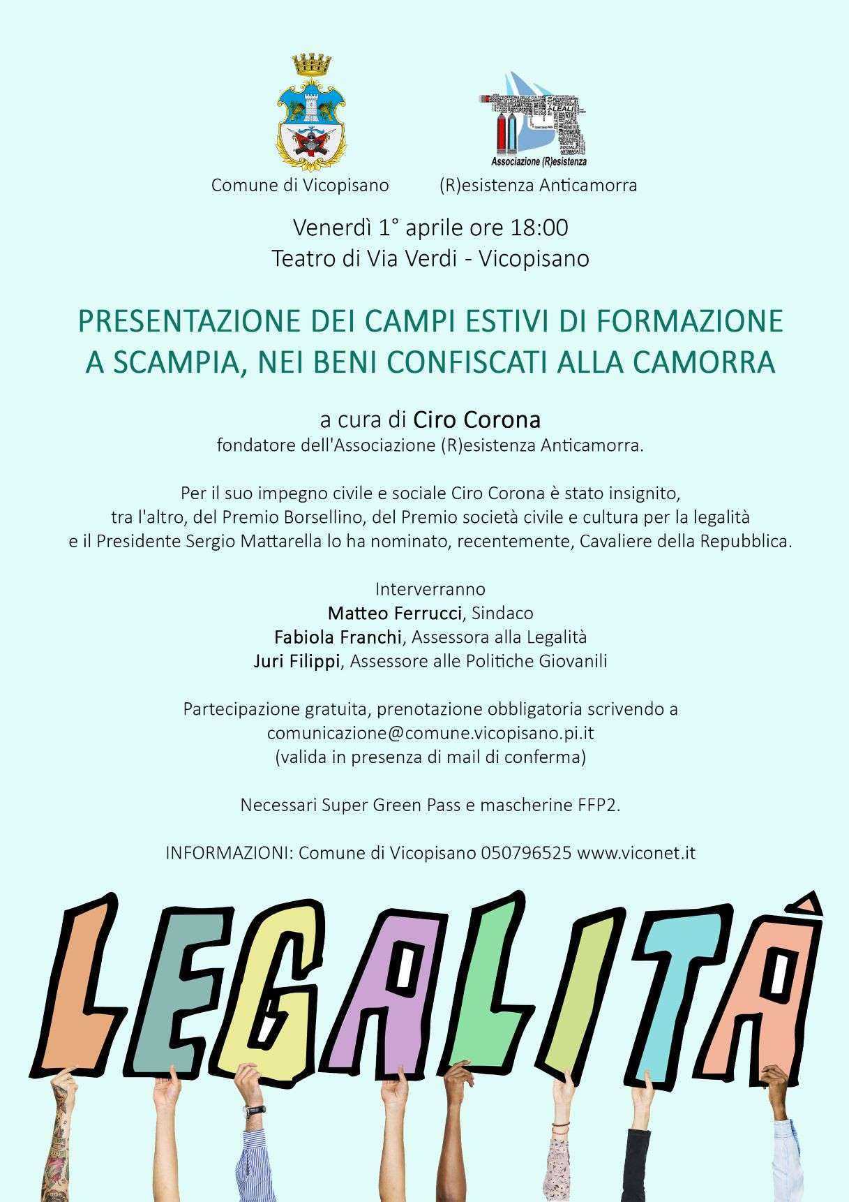 "Proprio in questo giorno di riflessione, di incontro e di testimonianza così importante _ dice il Sindaco Matteo Ferrucci _ informo la comunità, e seguiranno dettagli, che il 1° aprile, alle 18:00, insieme all'Assessora alla Legalità, Fabiola Franchi e all'Assessore alle Politiche Giovanili, Juri Filippi, ospiteremo al Teatro di via Verdi di Vicopisano Ciro Corona. Ci racconterà la sua vita - ha poco più di 40 anni ma è da oltre 20 anni che il suo impegno per un cambiamento civile e sociale a Scampia va avanti, incrollabilmente - e presenterà, in un incontro a cui confidiamo partecipino molti giovani, i campi estivi organizzati nei luoghi sottratti alla Camorra che l'Amministrazione intende proporre e sostenere, come forme di impegno e di 'pellegrinaggio civile' antimafia per i ragazzi e le ragazze."