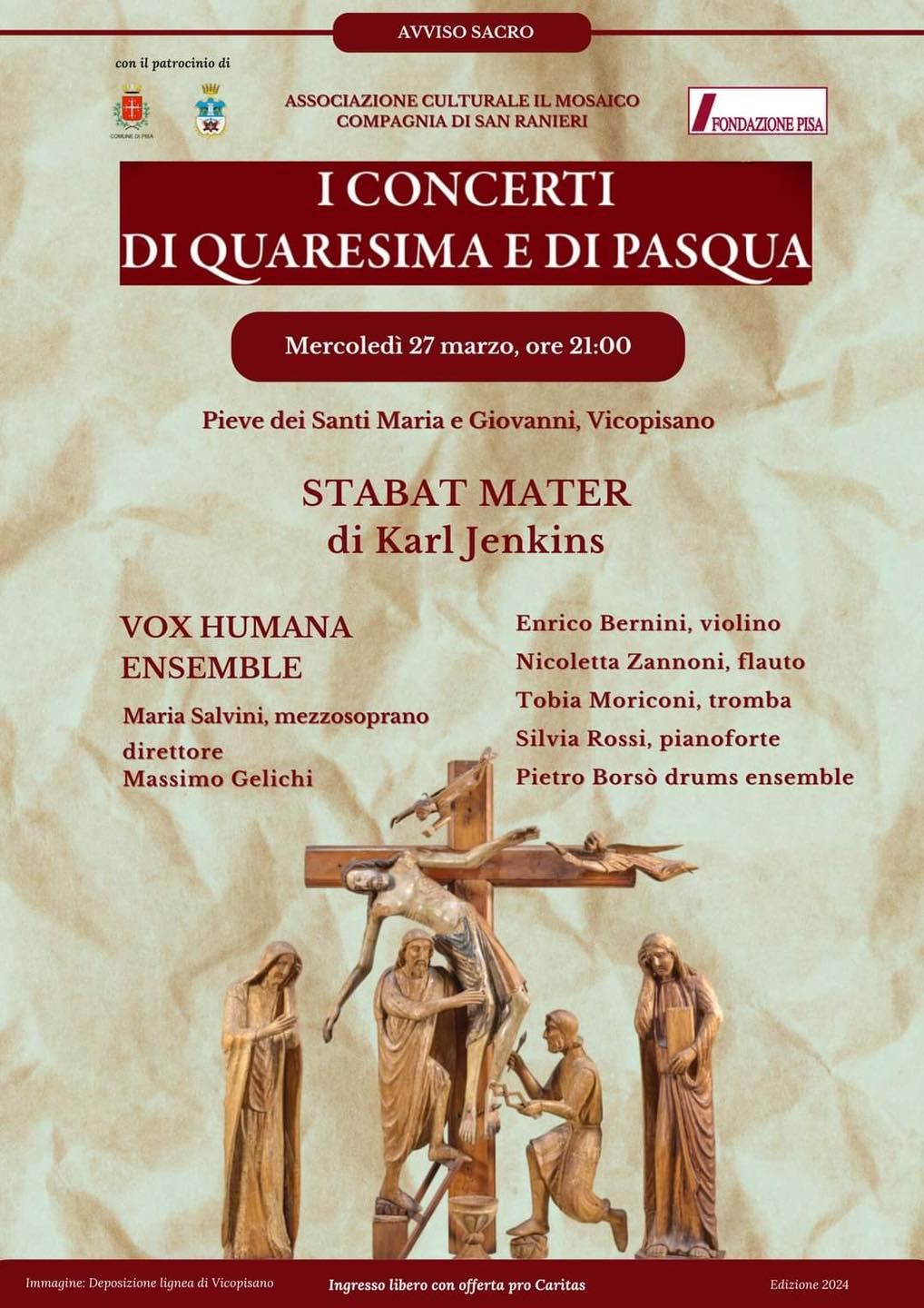 Mercoledì 27 marzo, ore 21:00, nella Pieve romanica di Santa Maria a Vicopisano con lo Stabat Mater di Karl Jenkins