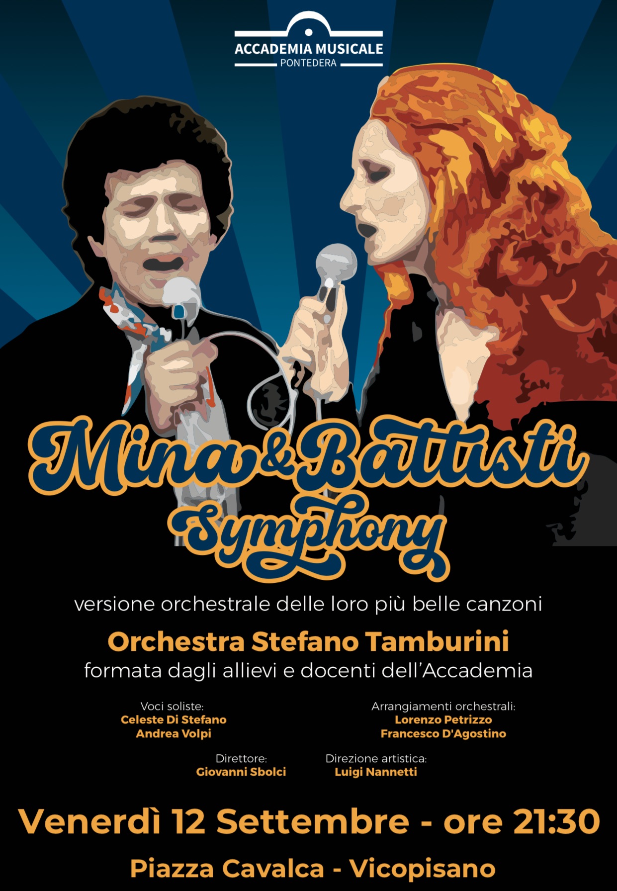Settembre ci attende con altra grande e bella musica, il 12 settembre, alle 21:30, l'Accademia Musicale Pontedera - che ha una sede anche nel nostro Comune _ presenta, in Piazza Cavalca a Vicopisano, il concerto live Mina & Battisti Symphony dell’Orchestra Stefano Tamburini, una versione orchestrale delle più belle canzoni di questi straordinari artisti, interpretati dalle meravigliose voci di Celeste Di Stefano e Andrea Volpi.