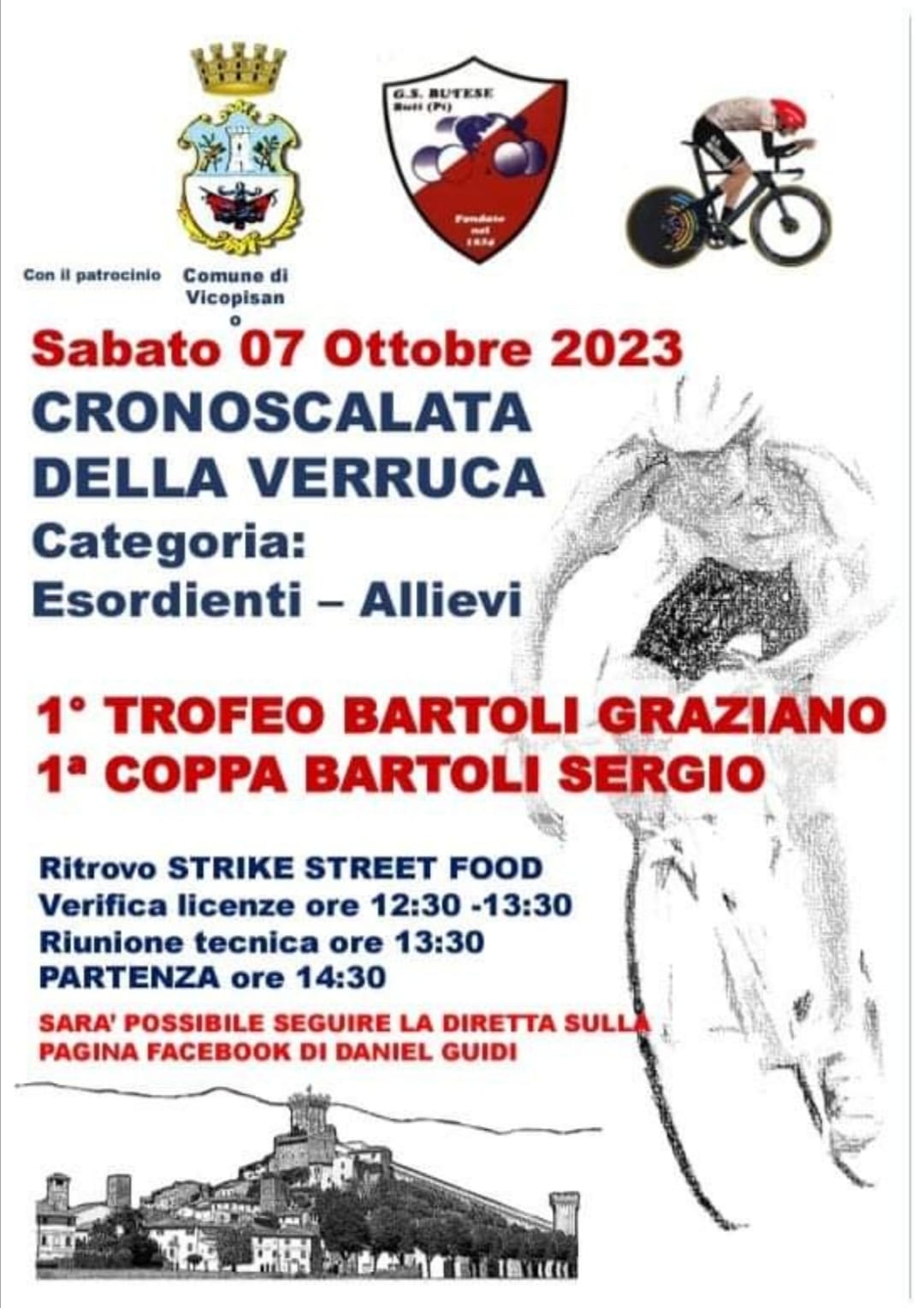 Il "Gruppo Sportivo Butese ciclismo" ha, infatti, organizzato una cronoscalata individuale della Verruca, per gli esordienti e gli allievi, il 7 ottobre, 1° Trofeo Graziano Bartoli-1° Coppa Sergio Bartoli, due nomi e un cognome molto importanti per il mondo del ciclismo e dello sport, per la nostra comunità... e non solo.