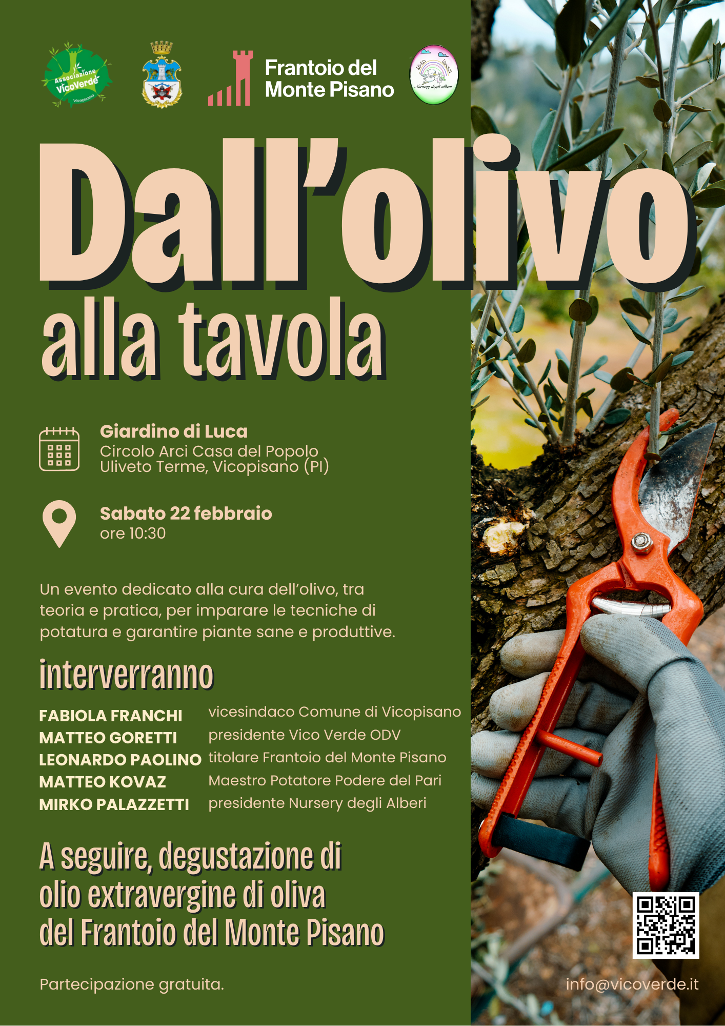 Dall'olivo alla tavola, questo il titolo del workshop, promosso da Vico Verde, con il patrocinio del Comune e la collaborazione del Frantoio del Monte Pisano, che si svolgerà a Uliveto Terme nel Giardino di Luca, adiacente al Circolo Arci Casa Del Popolo, sabato 22 febbraio dalle 10.30.
