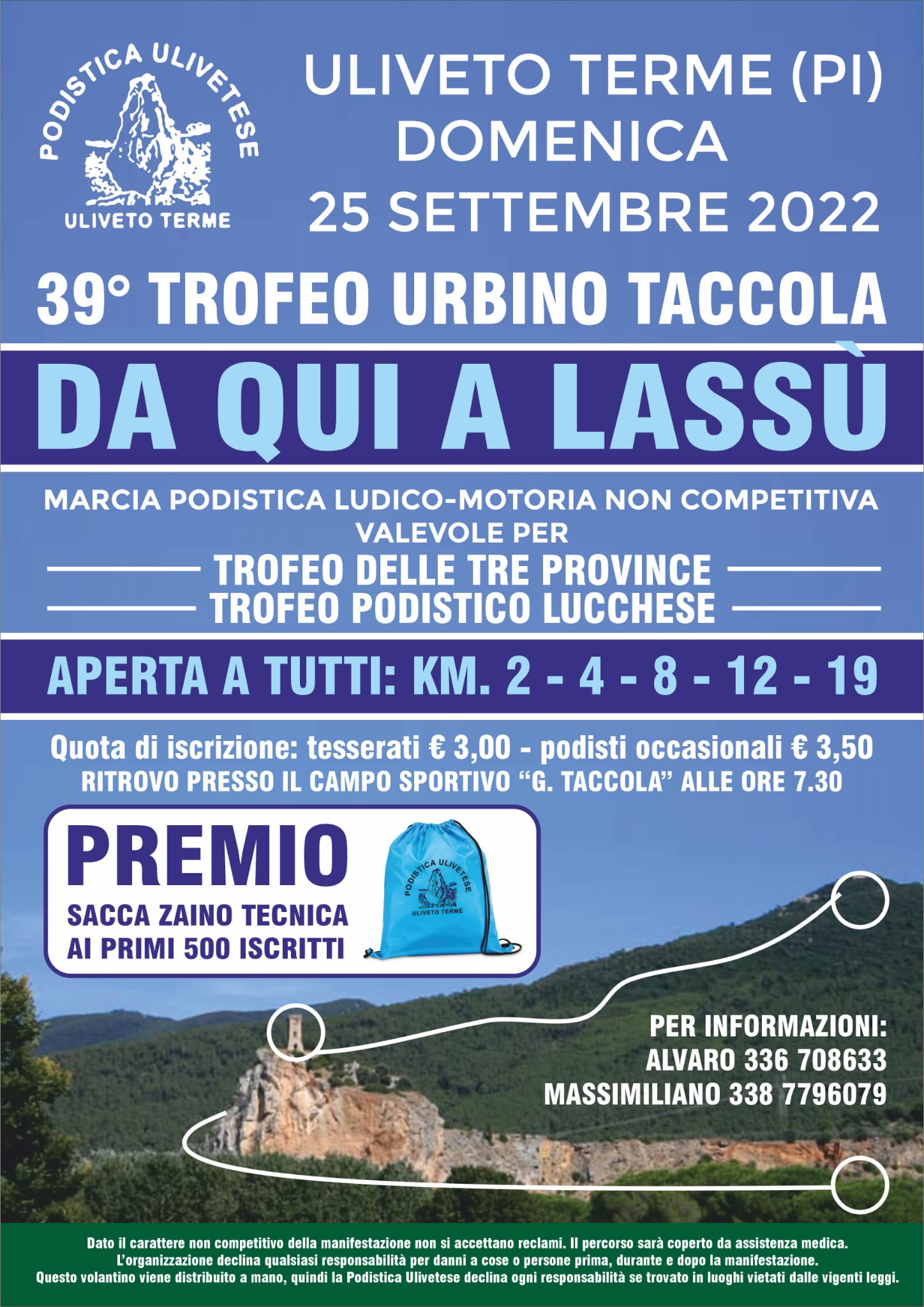 Per informazioni: 336/708633 (Alvaro) e 338/7796079 (Massimiliano)."Ringrazio, a nome dell'Amministrazione _ dice il Vicesindaco, con delega allo Sport, Andrea Taccola _ la Podistica Ulivetese per questa importante ripartenza del podismo amatoriale ed escursionistico, dopo la pandemia. L'associazione ha fatto un lavoro intenso, prendendosi cura e pulendo diversi sentieri sul Monte, un impegno che fa onore a questi volontari e che ha un valore anche turistico e di accoglienza per i visitatori e i turisti, sempre più numerosi, a piedi o in bici, ad ammirare i nostri splendidi paesaggi."