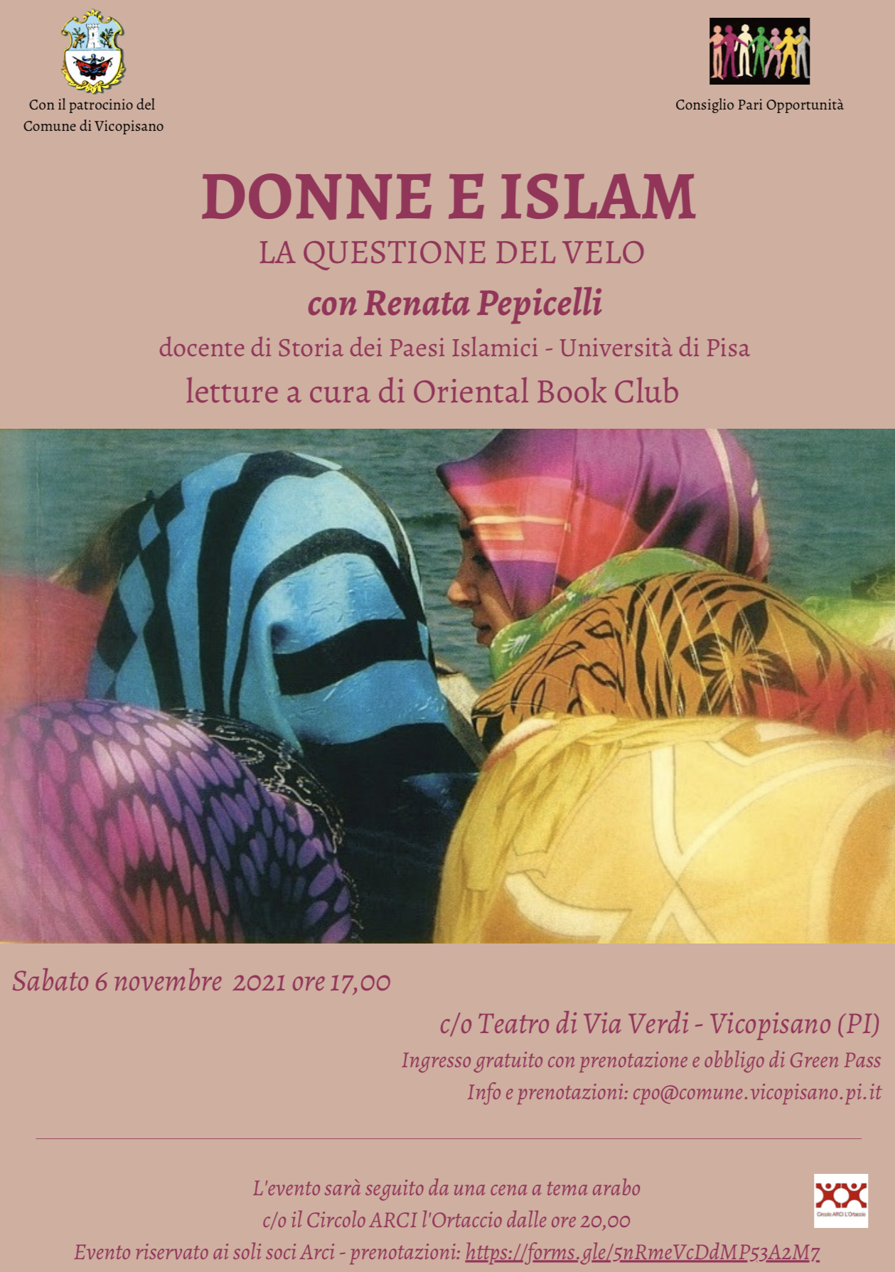 Il Consiglio per le Pari Opportunità ha organizzato un incontro con Renata Pepicelli, docente di Storia dei Paesi Islamici all'Università di Pisa, sabato 6 novembre alle 17:00, al Teatro di Via Verdi. Ingresso gratuito e prenotazione obbligatoria, scrivendo a cpo@comune.vicopisano.pi.it. Necessario essere muniti di Green Pass.