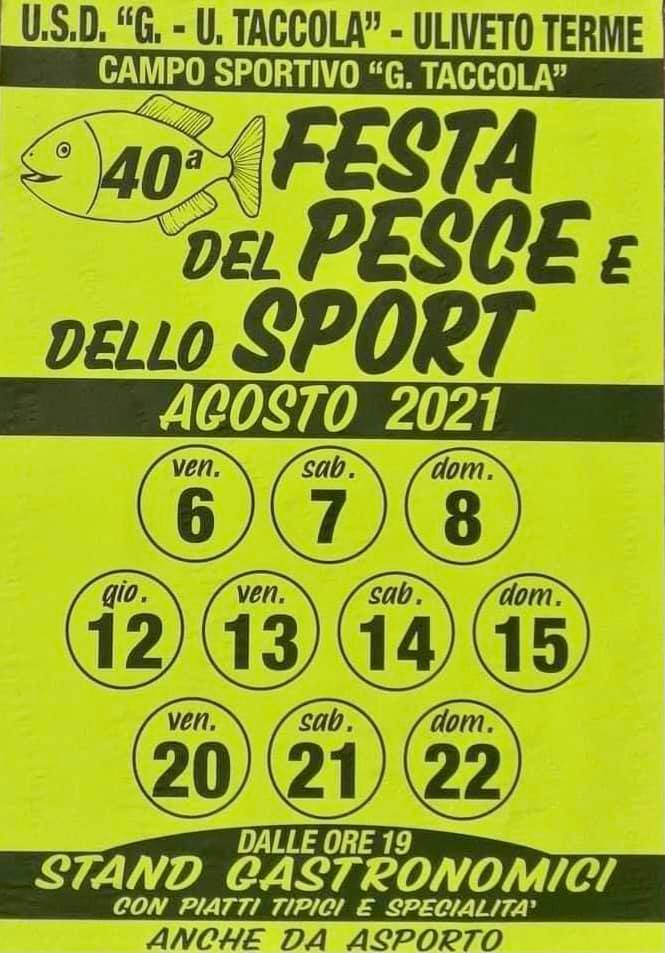 Inizia il 6 agosto la 40° edizione della Festa del pesce e dello sport, organizzata dalla società sportiva Urbino Taccola nello spazio sagre del campo sportivo Urbino Taccola di Uliveto Terme.Ricordiamo che dal 6 agosto, per accedere alla festa è necessario essere muniti di Green Pass (tutte le informazioni: www.dgc.gov.it/web/ ) e che l’autenticazione avverrà all’ingresso.La Festa del pesce e dello sport di Uliveto Terme unisce tradizione gastronomica, con piatti di pesce (e non solo) di grande qualità e passione sportiva!La società che la organizza, l’Urbino Taccola, la cui prima squadra milita in Promozione Toscana, ha fatto una notevole campagna acquisti e non nasconde giuste ambizioni, con l’impegno è il carattere che la caratterizzano, per questa stagione.