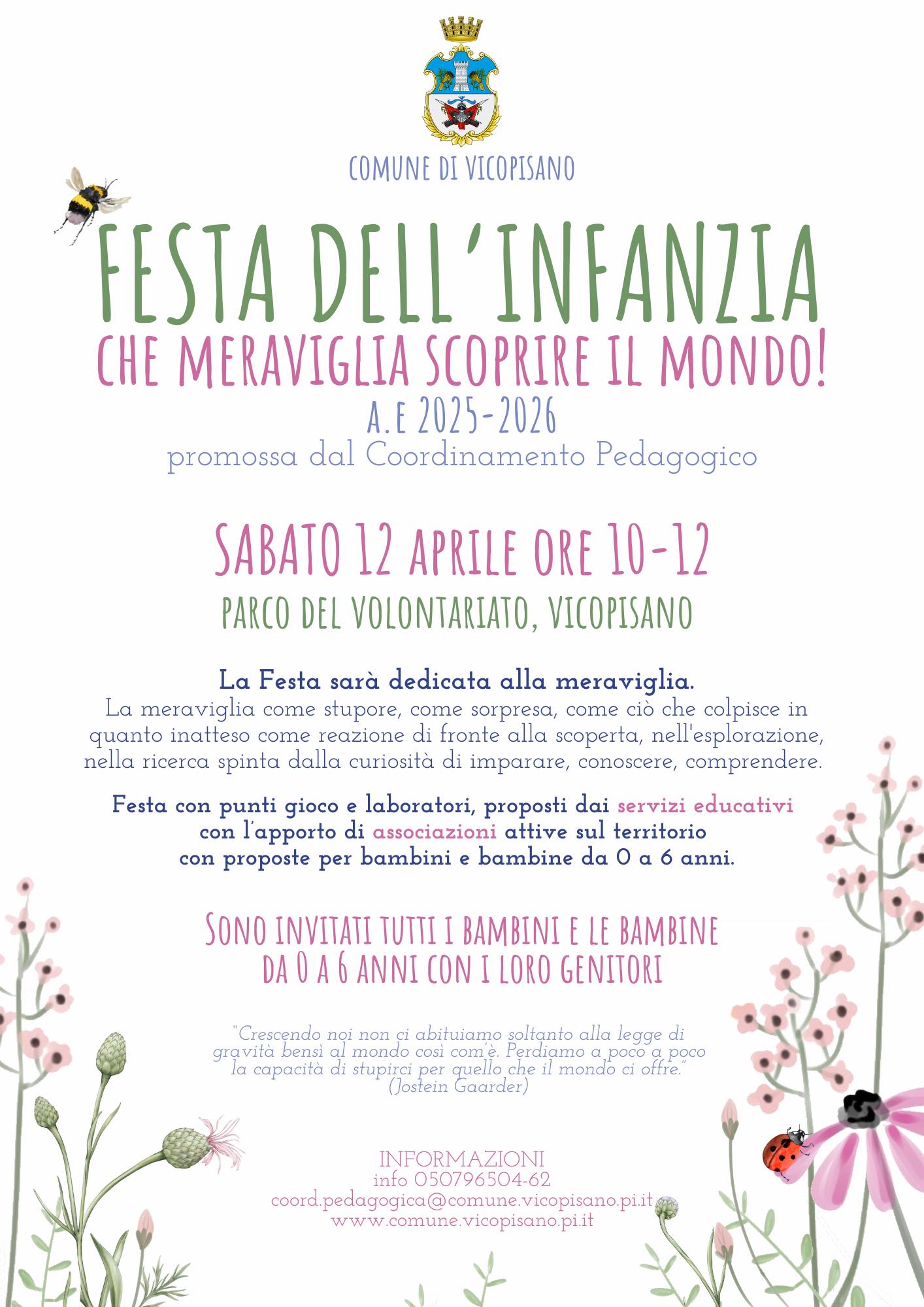 Festa dell’Infanzia, sabato 11 aprile, dalle 10:00 alle 12:00, nel Parco del Volontariato di Vicopisano… che meraviglia scoprire il mondo!