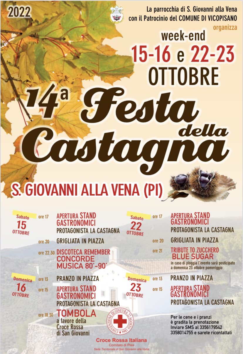 Torna per due weekend, quello del 15 e 16 e quello del 22 e 23 ottobre, la tradizionale Festa della Castagna di San Giovanni alla Vena, giunta alla sua 14ª edizione e organizzata dalla Parrocchia in Piazza della Repubblica, con il supporto del Comitato Castellare.