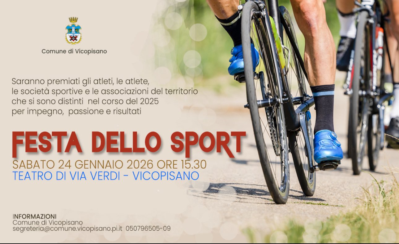 Festa dello Sport 2026: Premio alla Carriera a Denis Taccola e riconoscimenti per atleti, atlete e associazioni del territorio. La tradizionale Festa dello Sport torna sabato 24 gennaio alle ore 15:30 al Teatro di via Verdi, per celebrare atleti, atlete e associazioni sportive del territorio che nel 2025 si sono distinti per risultati, progetti e iniziative, anche con finalità solidali.