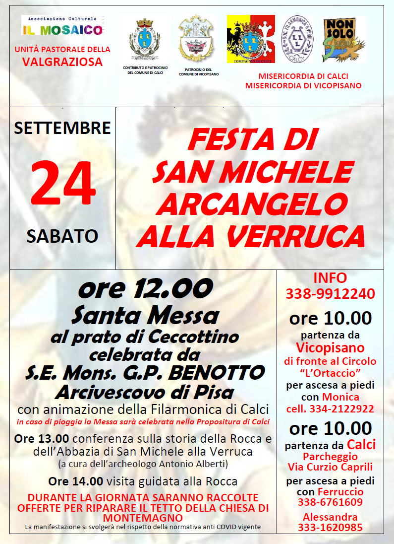Calci, la Misericordia di Calci, la Misericordia di Vicopisano, la Filarmonica Giuseppe Verdi di Calci, l’Associazione NONSOLOSERCHIO Nordic Walking e altre associazioni del territorio, nell’imminenza della solennità liturgica di San Michele Arcangelo, organizza una giornata di festa nei pressi della Rocca della Verruca, antico avamposto della Repubblica Pisana, e i ruderi dell’antica chiesa e monastero dedicato a San Michele Arcangelo.