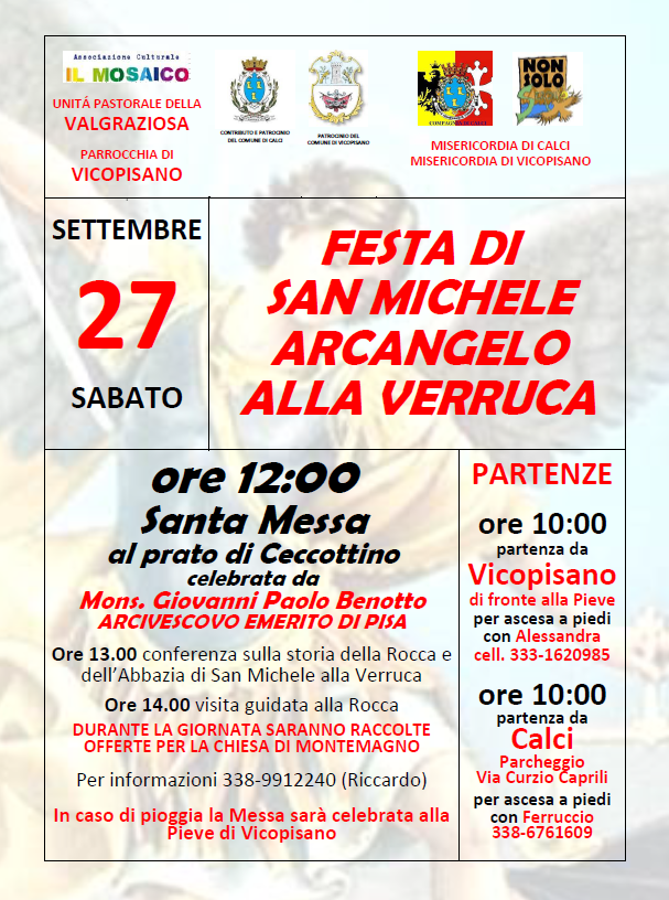 E’ diventata ormai una piacevole tradizione – avviata nel 2019 – la festa che l’Associazione Culturale Il Mosaico, alla vigilia della solennità liturgica di San Michele Arcangelo, organizza ogni anno nei pressi della rocca della Verruca, antico avamposto della Repubblica Pisana, e dei resti dell’antica chiesa e del monastero dedicato a San Michele Arcangelo.