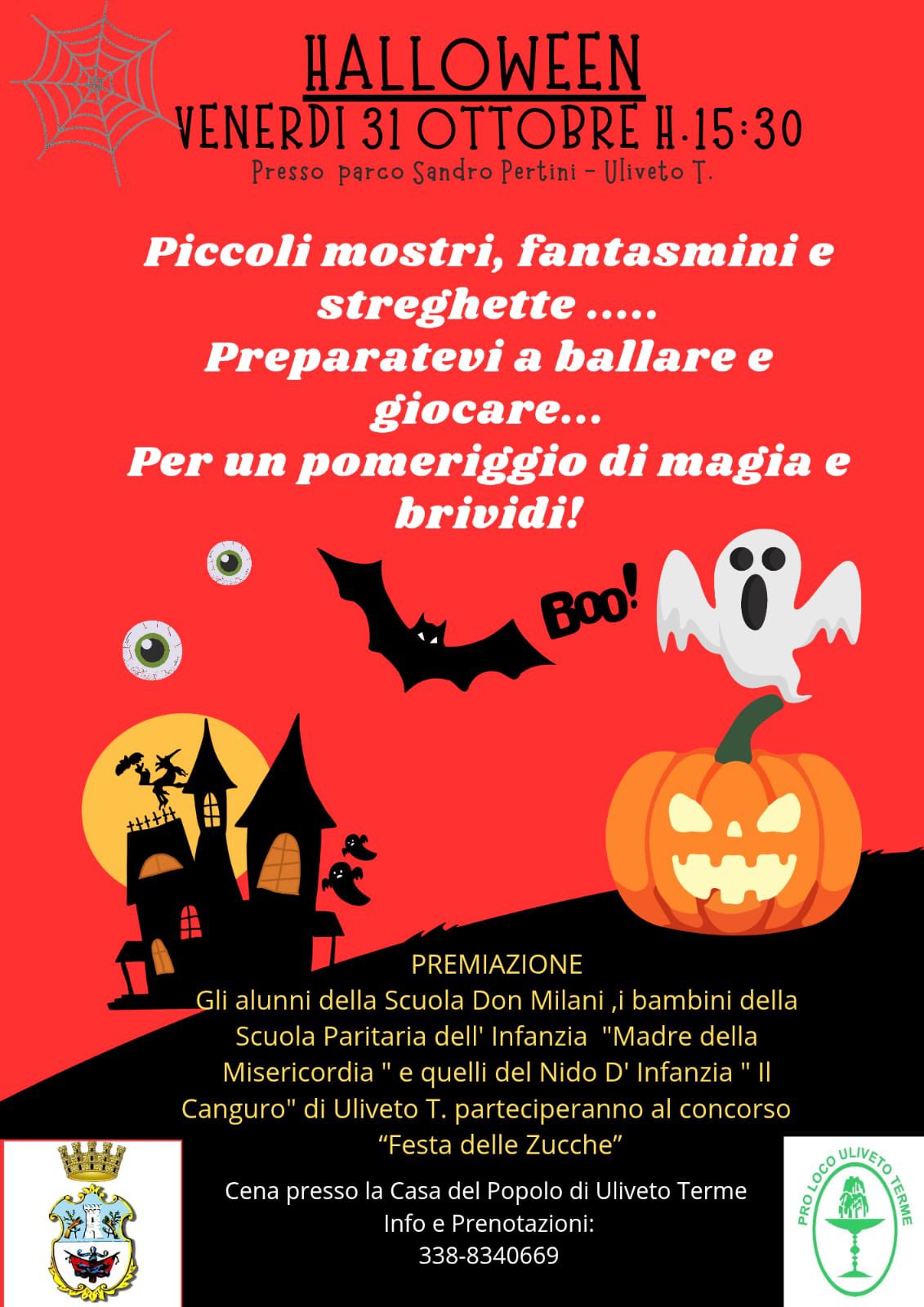 Il 31 ottobre, dalle 15:30, il Parco Pertini, in Via della Madonnina a Uliveto Terme, accoglierà fantasmini, streghette e deliziosi mostriciattoli per un pomeriggio di balli, giochi, sorprese e scherzetti, organizzato dalla Pro Loco Uliveto Terme, in collaborazione con la Casa Del Popolo e con il patrocinio del Comune.