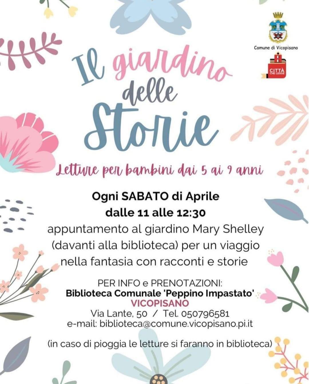 Ogni appuntamento con racconti, storie e fantasia è gratuito.La prenotazione è obbligatoria telefonando (anche per informazioni) in Biblioteca o scrivendo a biblioteca@comune.vicopisano.pi.it.