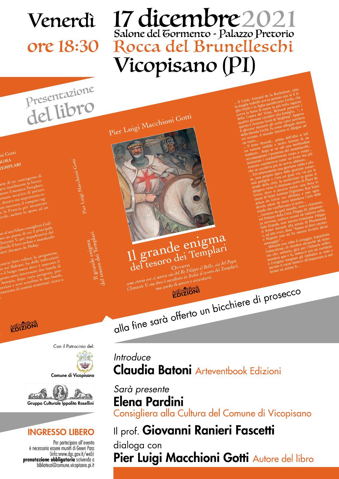 Il Grande Enigma del Tesoro dei Templari, Edizioni Arteventbook, presentazione del libro di Pierluigi Macchioni Gotti, nel Salone del Tormento di Palazzo Pretorio, venerdì 17 dicembre alle 18:30.
