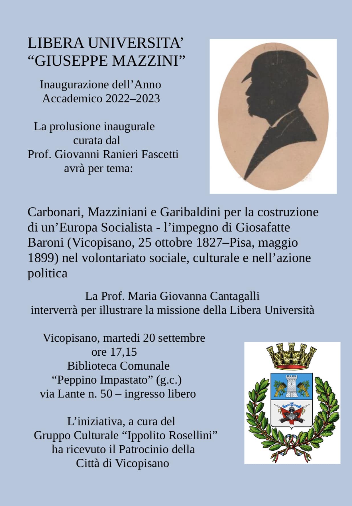 La prolusione inaugurale, curata dal professor Giovanni Ranieri Fascetti, avrà come tema: “Carbonari, Mazziniani e Garibaldini per la costruzione di un’Europa socialista, l’impegno di Giosafatte Baroni (Vicopisano, 25 ottobre 1827-Pisa, maggio 1899) nel volontariato sociale, culturale e nell’azione politica.” La professoressa Maria Giovanna Cantagalli interverrà, a sua volta, per illustrare la missione della Libera Università.