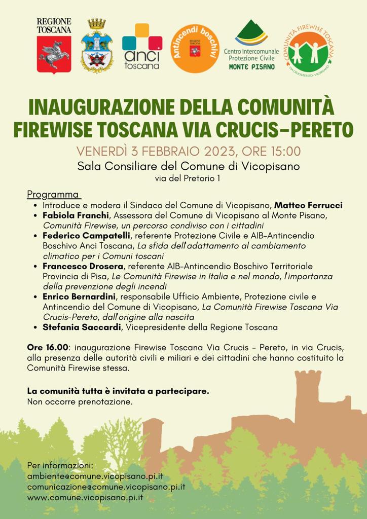Alle 16:00 si terrà, quindi, l’inaugurazione della Firewise di Vicopisano, alla base della salita che conduce al complesso di Via Crucis, alla presenza delle autorità civili e militari e dei cittadini e delle cittadine che hanno costituito la comunità di Via Crucis-Pereto.
