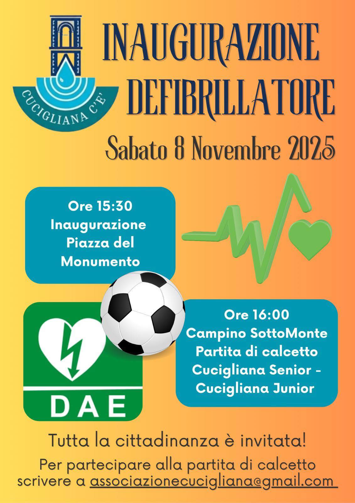 Sabato 8 novembre, grazie all’impegno dell’associazione Cucigliana c'è e alla partecipazione dei cittadini e delle cittadine ai numerosi eventi estivi organizzati, sarà inaugurato un nuovo defibrillatore pubblico (DAE) in Piazza del Monumento.