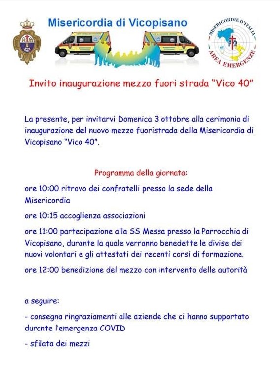 Inaugurazione mezzo fuori strada Vico 40 della Misericordia di Vicopisano, domenica 3 ottobre a partire dalle 10:00 in Piazza della Pieve a Vicopisano