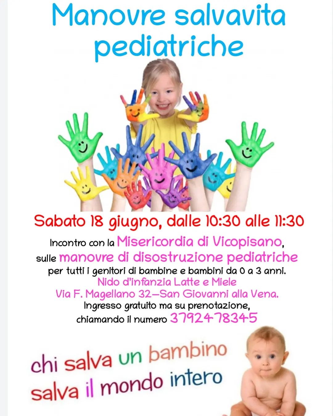 La Misericordia di Vicopisano organizza un incontro informativo sulle manovre salvavita pediatriche, sabato 18 giugno, dalle 10:30 alle 11:30, per i genitori (e nonni, zii, chiunque sia interessato) di bambini e bambine da 0 a 3 anni.