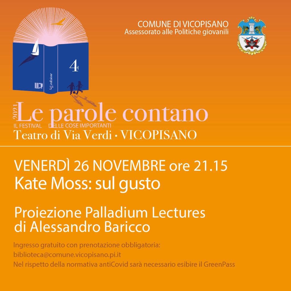 Nuovo appuntamento con il festival Le parole contano, venerdì 26 novembre alle 21: 15, al Teatro di via Verdi, e la proiezione di "Kate Moss: sul gusto", una delle celebri lezioni di Alessandro Baricco al Teatro Palladium di Roma.