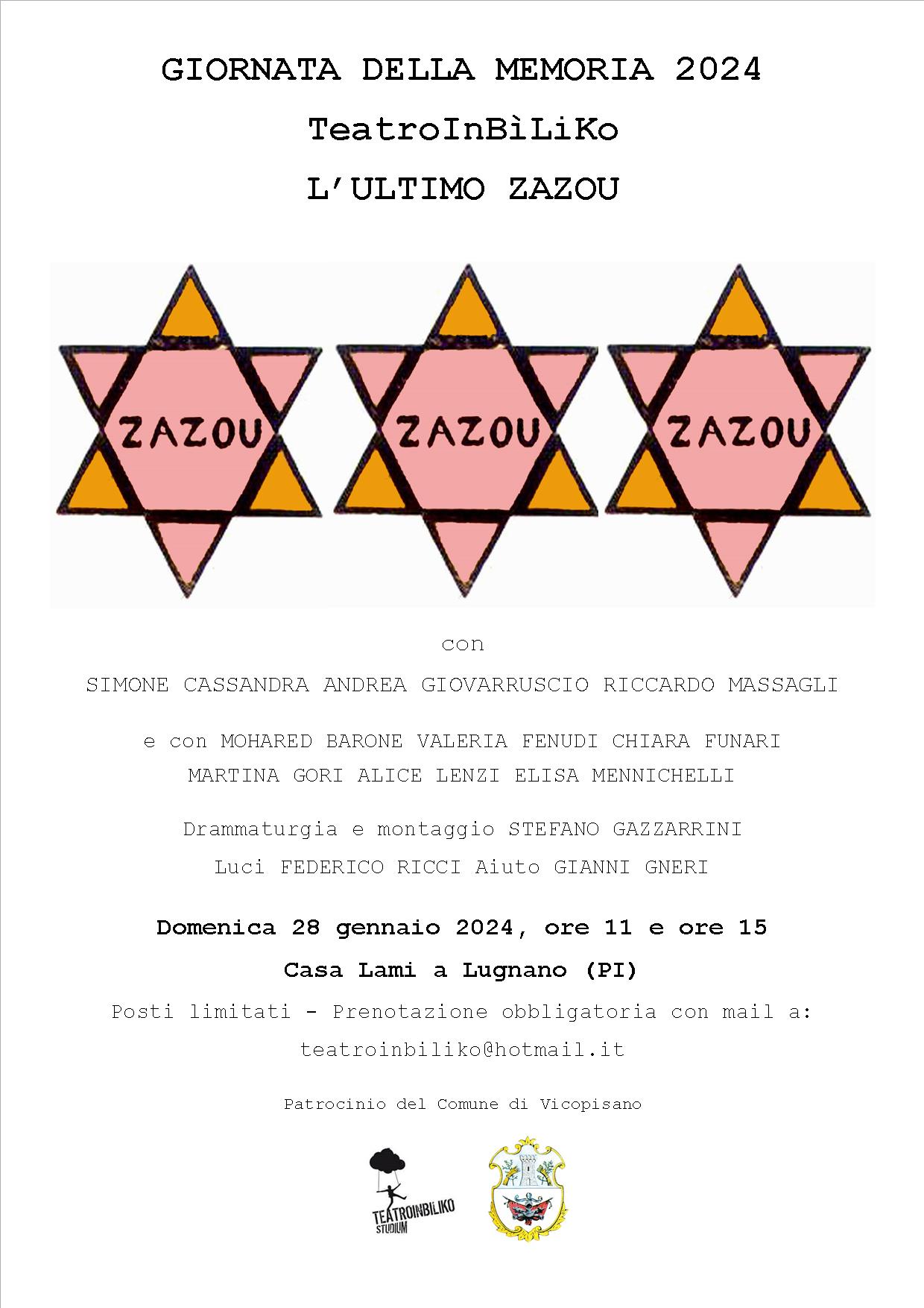 Spettacolo "L'ultimo Zazou", di Teatro InBìliko, nell'ambito del programma delle iniziative per la Giornata della Memoria, promosso dall'Amministrazione Comunale, domenica 28 gennaio in doppia replica alle 11:00 e alle 15:00 al B&B Casa Lami di Lugnano.
