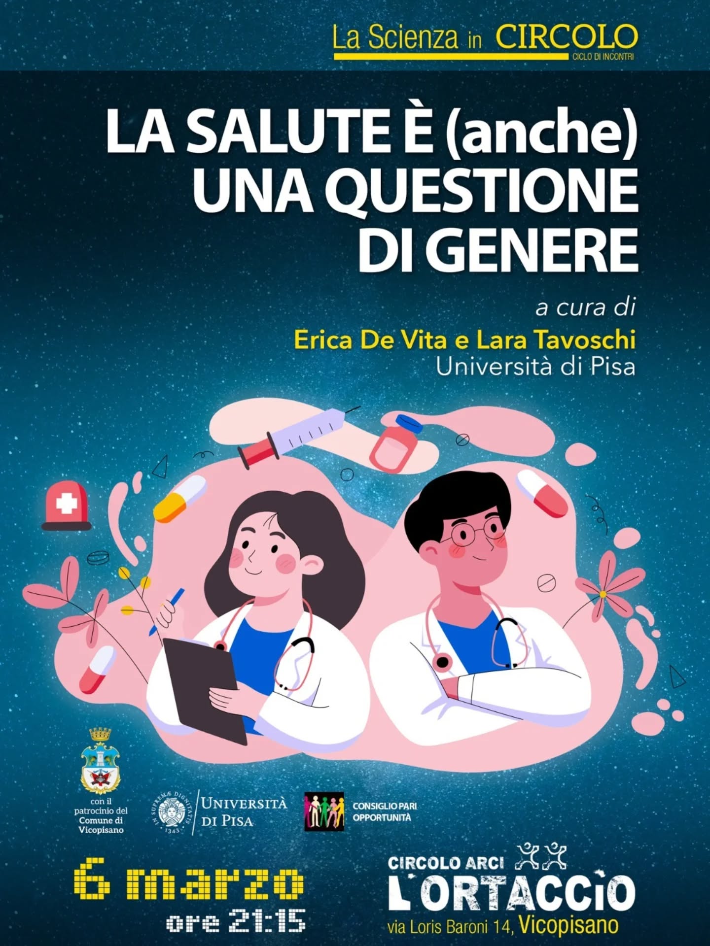 Venerdì 6 marzo alle 21:15 al Circolo l’Ortaccio di Vicopisano, per il ciclo “Scienza in Circolo”, e per il Marzo di Donna, Erica De Vita e Lara Tavoschi (Università di Pisa) parleranno del rapporto tra salute e genere.