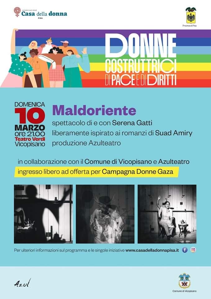 Spettacolo al Teatro di Via Verdi, il 10 marzo alle ore 21:00, con ingresso a offerta per la "Campagna Donne Gaza" (prenotazione obbligatoria: cpo@comune.vicopisano.pi.it) liberamente ispirato ai romanzi di Suad Amiry, di e con Serena Gatti, prodotto da Azulteatro.