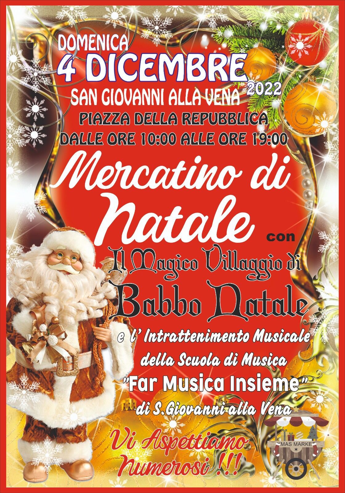 Il Comitato La Nuova Piazza, in collaborazione con la scuola "Far Musica insieme" e Il Salotto di Pampa, hanno organizzato il Mercatino di Natale, con il magico villaggio di Babbo Natale, domenica 4 dicembre in Piazza della Repubblica a San Giovanni alla Vena, dalle 10:00 alle 19:00